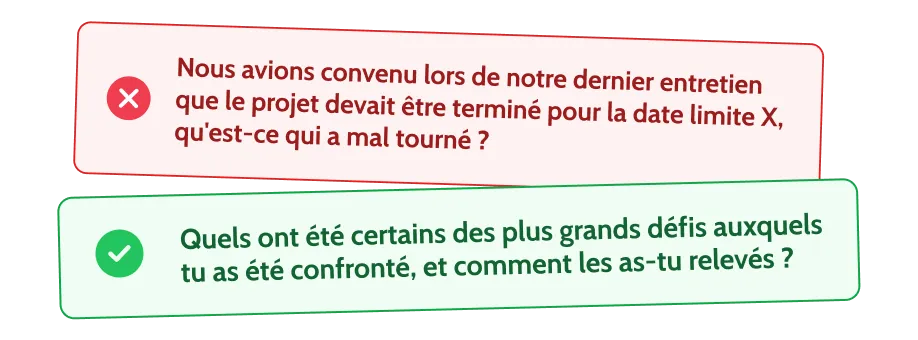 La négativité peut provoquer des réactions défensives et faire dérailler l’entretien. Évitez les remarques insultantes ou dénigrantes et** concentrez-vous sur des critiques constructives. **Poser des questions sur les défis et les solutions aide à maintenir une ambiance positive.