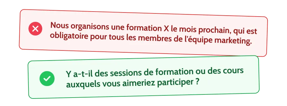 Demandez du feedback: Demandez à l’employé son avis et ses suggestions pour vous améliorer. Cela favorise un dialogue ouvert et une compréhension mutuelle.