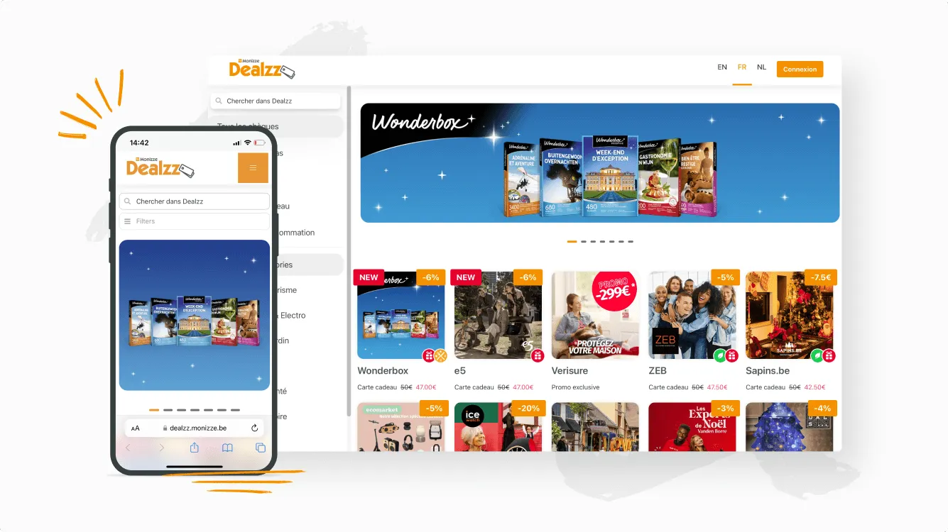 Outre l’utilisation de vos chèques en ligne ou en magasin, vous pouvez profiter d’offres et de réductions intéressantes grâce à notre plateforme d’avantages Dealzz. Vous pouvez par exemple les utiliser pour acheter des cartes-cadeaux à prix réduit pour Center Parcs, Technopolis ou le Zoo d’Anvers !