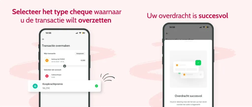Een transactie met uw maaltijd- of ecocheques overzetten naar uw cadeaucheques of koopkrachtpremie is mogelijk.